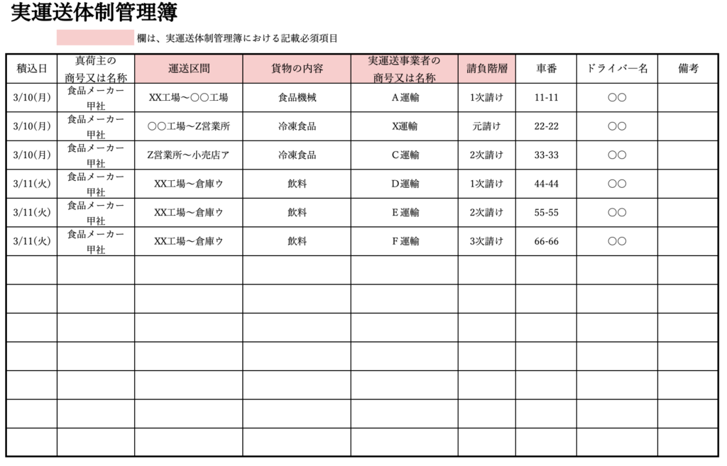 テンプレートの具体例としては、横方向に案件ごとの情報(荷主名、依頼日、貨物概要、運送区間、運送日など)、縦方向に各階層の事業者名や請負階層を並べた表形式が分かりやすいでしょう。案件数が多い事業者の場合、配車システムからデータを取り込んで自動反映する仕組みを作ると、運用負荷を抑えられます